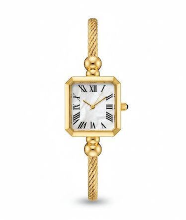 قاب کوچک و مربعیشکل در کنار صفحهی روشن با اعداد رومی، حس ساعتهای کلاسیک و جواهری را منتقل میکند و آن را به گزینهای مناسب برای استایلهای رسمی و مجلسی تبدیل میسازد.
