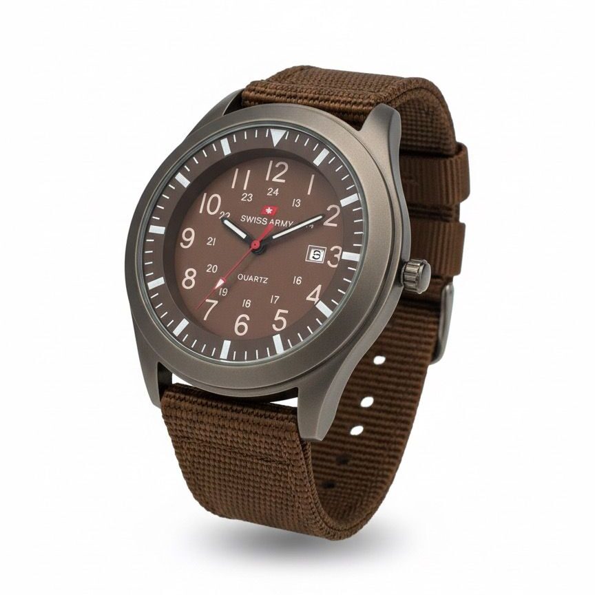 در این مدل، همه چیز حول محور سادگی و کاربردی بودن طراحی شده است. بدنه مات با رنگی خنثی ظاهر ساعت را بسیار شیک، مردانه و متفاوت نشان می‌دهد. صفحه قهوه‌ای همراه با عقربه‌های روشن و ثانیه‌شمار قرمز، حس ساعت‌های نظامی واقعی را منتقل می‌کند.