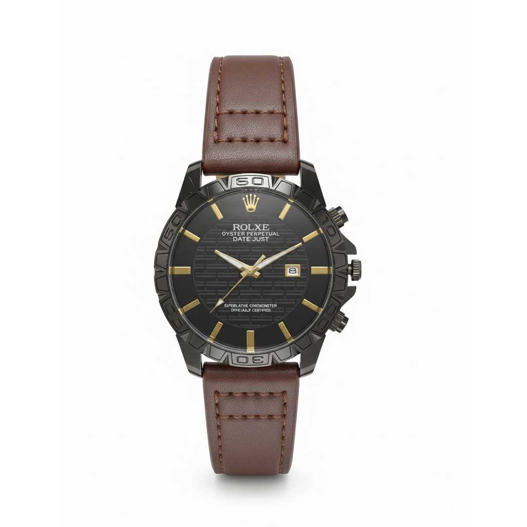 ساعت مردانه طرح رولکس دیت جاست | بند چرمی قهوهای ،صفحه مشکی لوکس
