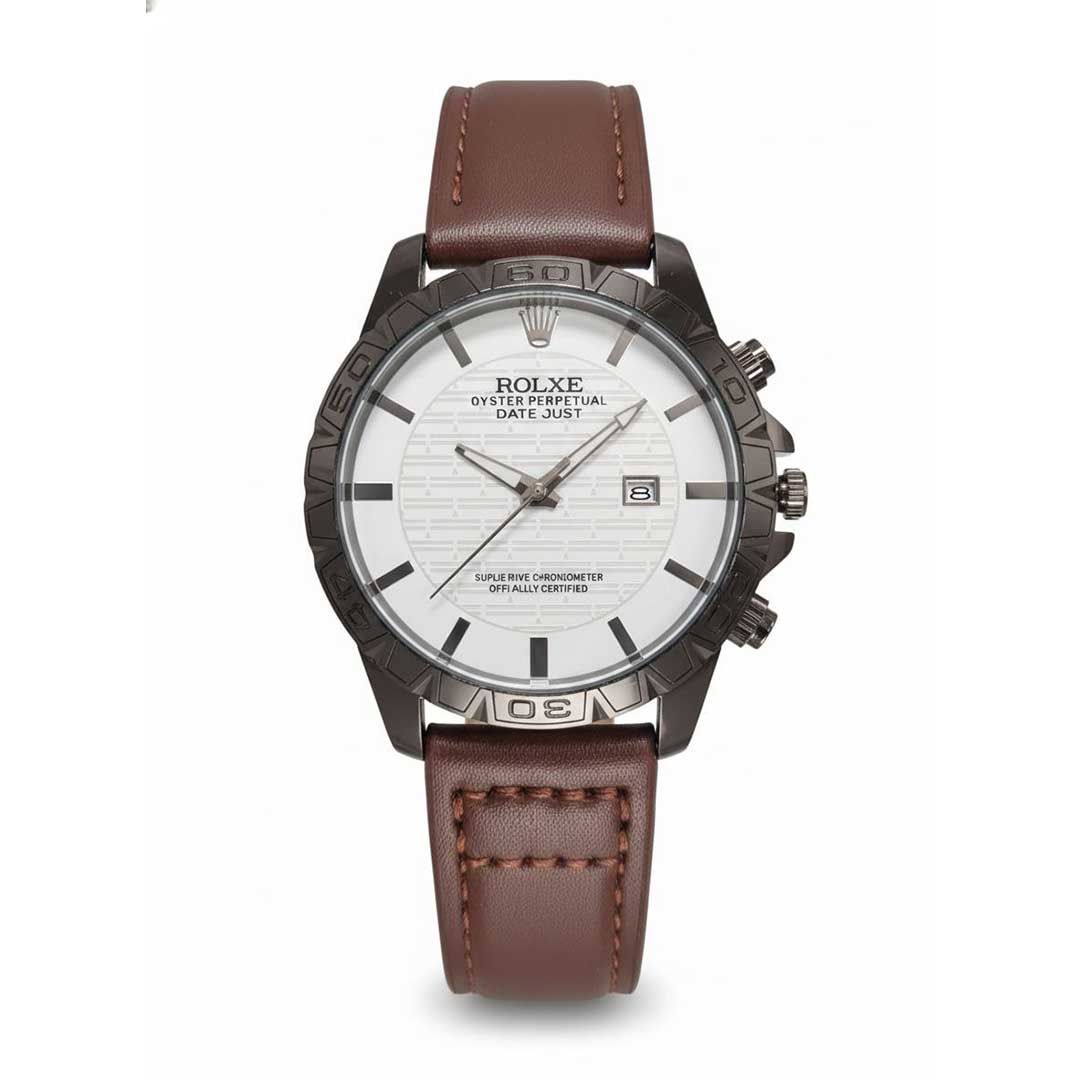ساعت مردانه طرح رولکس دیت جاست | بند چرمی قهوهای، صفحه سفید