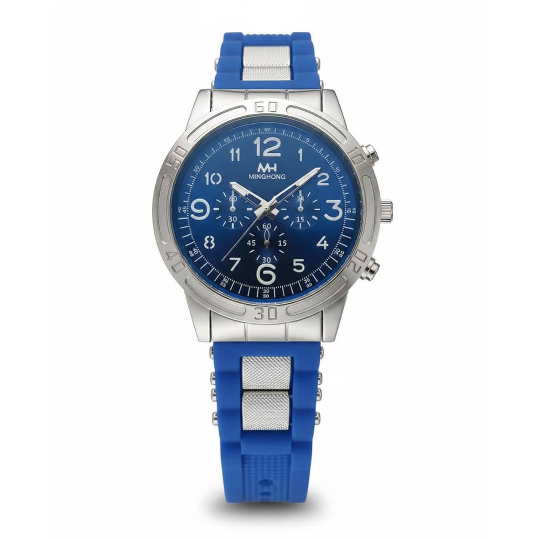 ساعت مردانه MINGHONG ژلهای صفحه آبی مدلی اسپرت و مدرن است که برای آقایانی طراحی شده که به استایلهای روزمره، خیابانی و پرانرژی علاقه دارند. رنگ آبی صفحه در کنار بند ژلهای، جلوهای پویا و چشمگیر ایجاد میکند که بهراحتی روی مچ دیده میشود.
